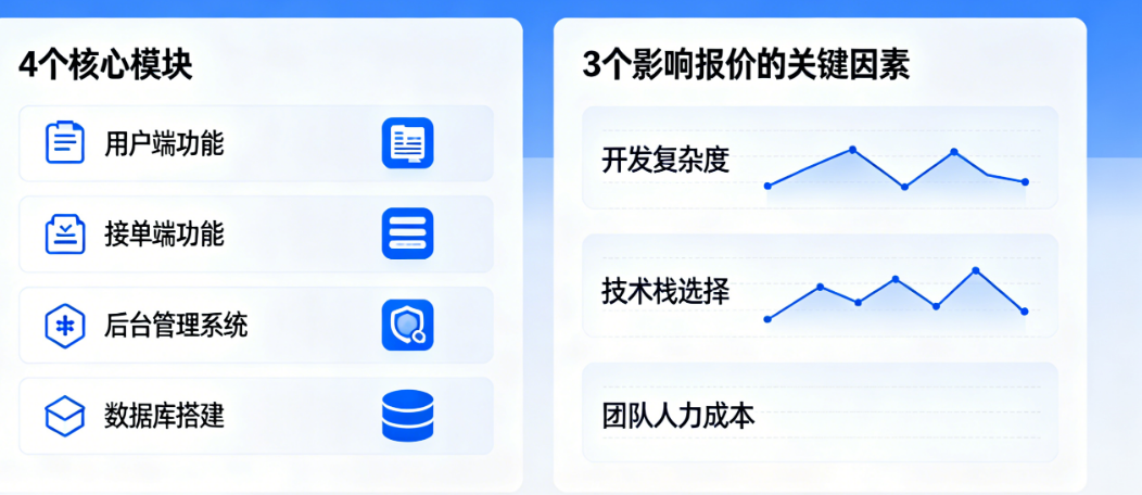 一个完整的同城接单APP绝非一个简单的界面,它是由一系列相互关联、共同协作的系统模块构成的。以下是驱动其运转的四大核心成本模块,也是我们进行 “同城接单APP开发成本详解” 的切入点。对这四个模块的深入理解,是完成本次 “同城接单APP开发成本详解” 的关键。