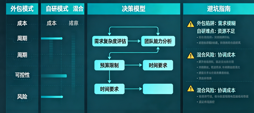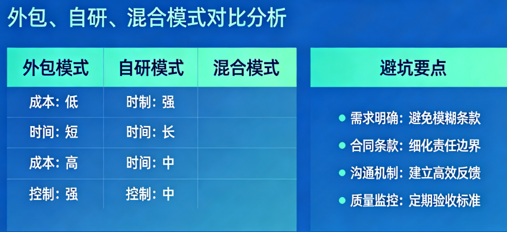 这是前两种模式的结合。通常将核心、机密或需持续迭代的模块留给自研团队,而将相对独立、技术成熟或临时性强的模块(如某个特定功能、H5活动页、跨平台适配等)外包出去。