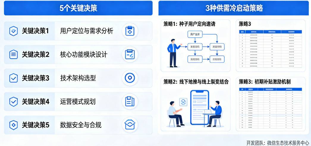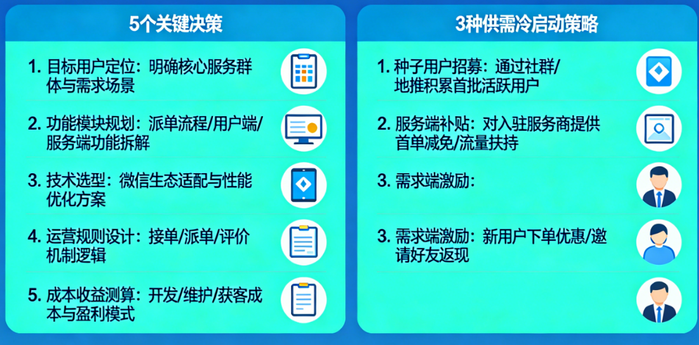 开发一个 微信派单O2O小程序,本质上是在构建一个数字化的双边市场。这意味着你必须同时让两群人满意:发布任务的需求方,和提供服务或技能的供给方。忽略任何一方的体验和诉求,都会导致整个系统的崩塌。今天,我们不讨论具体的技术实现,而是聚焦于那些必须在第一行代码敲下之前就想清楚的5个关键决策,以及系统上线后如何快速启动供需双方的3种有效策略。