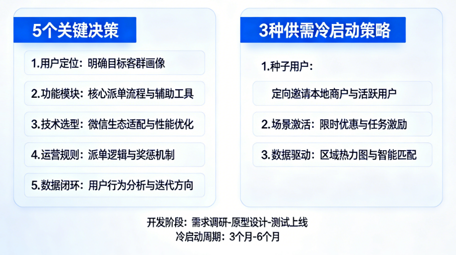 开发一个派单O2O小程序是一场马拉松,而不是百米冲刺。前期的5个关键决策决定了你的赛道是否正确,而3种冷启动策略则决定了你起跑是否稳健。最危险的时刻往往出现在上线后的头三个月——当最初的新鲜感过去,真实而残酷的市场反馈到来时。
