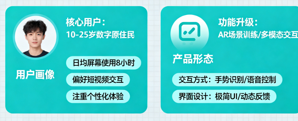 VR/AR设备使用者、硬核游戏玩家、元宇宙内容创造者。他们的视觉系统面临独特挑战:虚拟与现实场景的快速切换冲突、立体视觉的异常负荷、动态视觉追踪能力的极限测试。这类用户追求极致的沉浸体验,但常被晕动症、视觉滞后感等问题困扰。他们需要的训练,更接近“视觉系统性能调优”,以匹配前沿科技的体验需求。