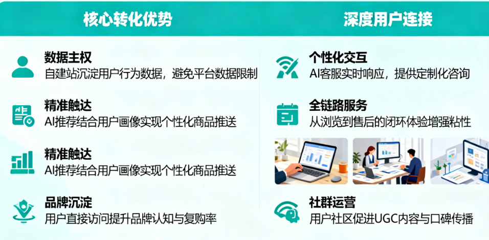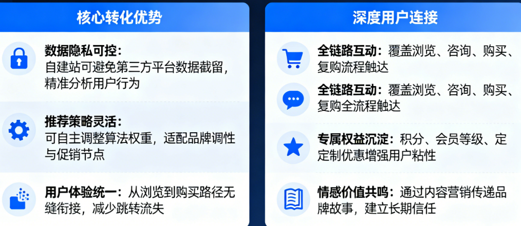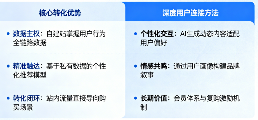 要透彻理解这一点,就必须同时回答那两个核心问题:自建站的核心转化优势是什么?如何建立深度用户连接? 实际上,它们是一体两面——优势正是通过“深度连接”来实现和巩固的。没有连接的“优势”是空洞的,没有优势导向的“连接”是无效的。