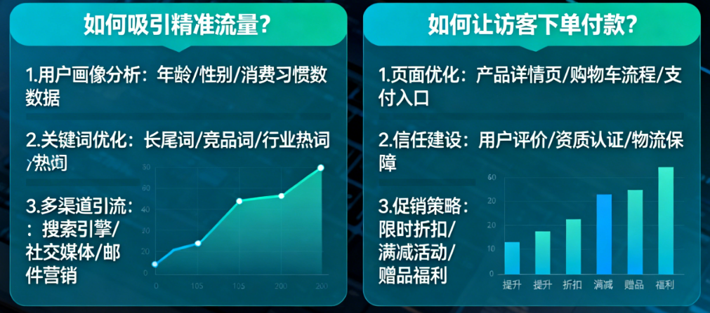 理解这一点,是破解 “如何吸引精准流量?如何让访客下单付款?” 这对孪生难题的第一步。因为精准流量本身,就蕴含着更高的转化潜力;而一套好的转化策略,又能将这股潜力彻底释放。两者结合,才是生意的正循环。