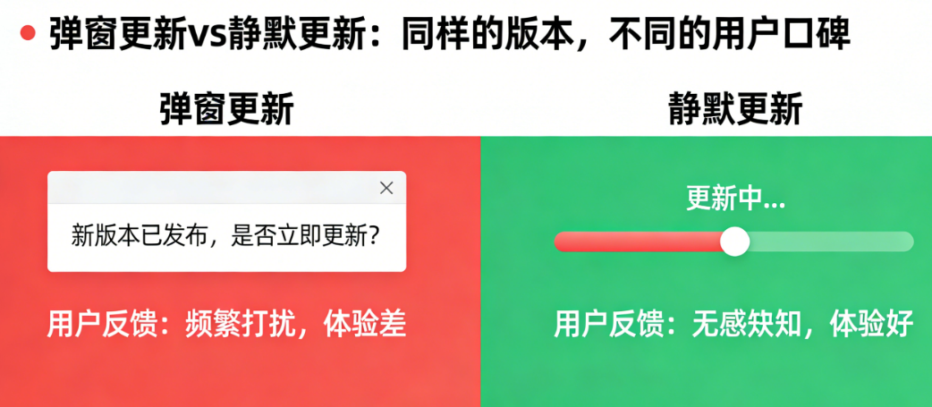 问题的关键,不在于“要不要更新”,而在于“怎么更新”。同样的版本内容,用弹窗的方式推给用户,和用静默的方式在后台完成,用户对APP的口碑可能天差地别。