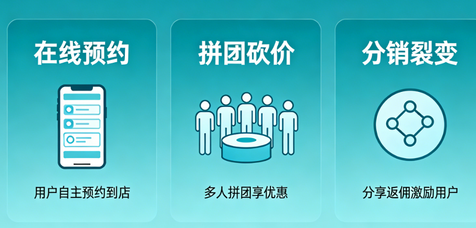 而那些生意红火的门店,早就换了一套打法。她们不再被动等客,而是用一套组合拳,让顾客主动上门、主动预约、主动带朋友来。这套组合拳,就是美业APP的“获客三板斧”:在线预约、拼团砍价、分销裂变。