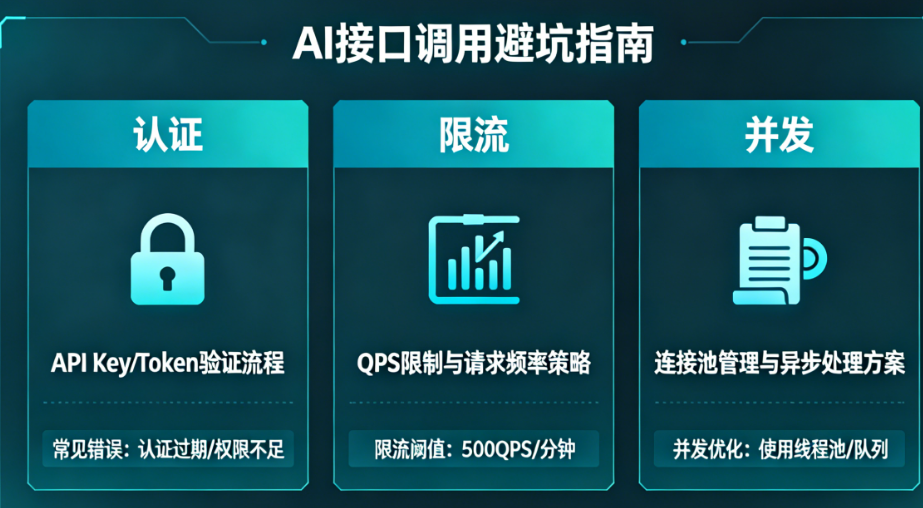 本文将从认证、限流、并发三个核心维度,梳理AI接口调用中最常见的“坑”,并提供实战级的解决方案。无论你是刚接触AI接口的新手,还是正在优化生产系统的老手,这份指南都能帮你少踩几个雷。
