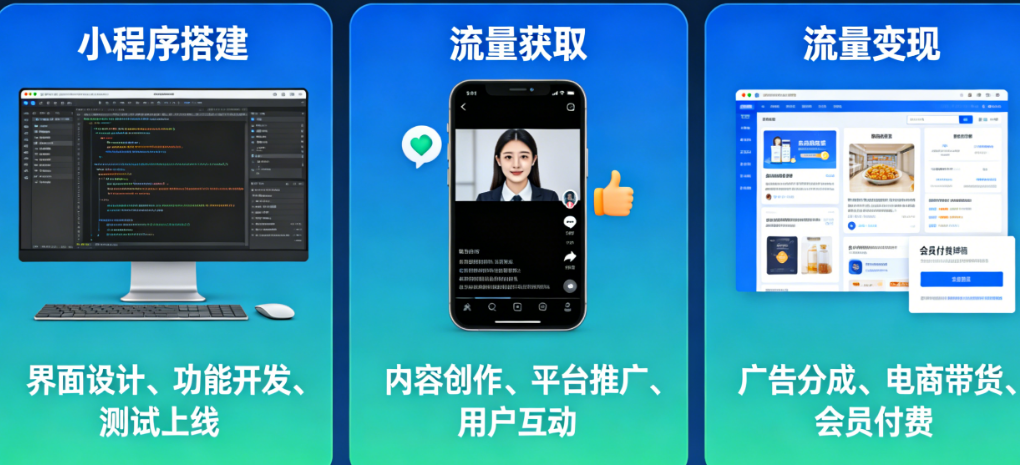 在给解决方案之前,咱们先对号入座,看看你踩了哪几个坑。这些坑归根结底,都绕不开那三个核心问题——小程序怎么搭?流量怎么来?变现怎么做? 只有把这三大关闯过去,你的小程序才能真正活起来。