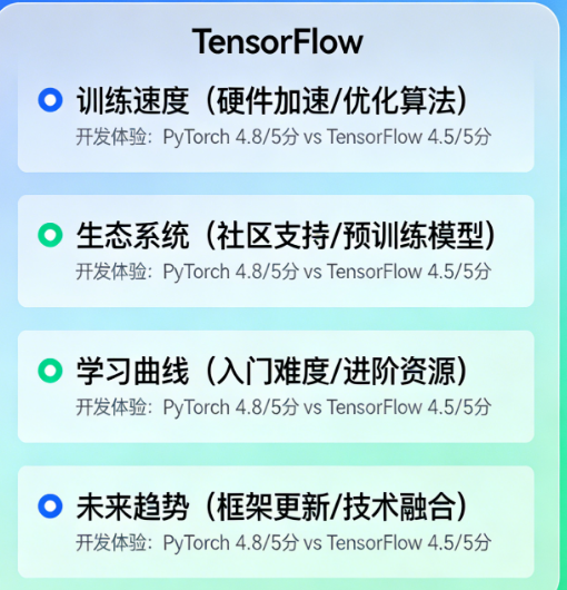 A:如果你是自学,建议从PyTorch开始。原因很简单:它的代码更符合直觉,调试更方便,遇到问题更容易在Stack Overflow和GitHub上找到现成答案。先建立对深度学习的正确理解,再学TensorFlow的生产部署逻辑会轻松很多。如果你是参加培训或跟着学校课程,听老师的——但大概率也是PyTorch。