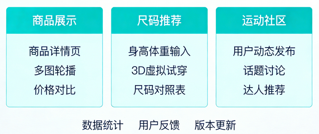 痛点场景:当你想要开发一款运动装备小程序时,是否常常陷入这样的困境——功能清单列了一大堆,却不知道哪些是刚需、哪些是鸡肋;竞品该有的功能都有了,自己的小程序却还是留不住用户;投入了大量资源开发,上线后才发现核心体验存在致命短板。运动装备这个品类尤其特殊,它不像快消品那样“闭眼入”,用户对尺码适配性极度敏感,对产品专业性要求极高,同时天然具备社交属性。如果产品规划阶段没有建立起完整的功能矩阵,后续的开发和运营都会像在流沙上盖楼。