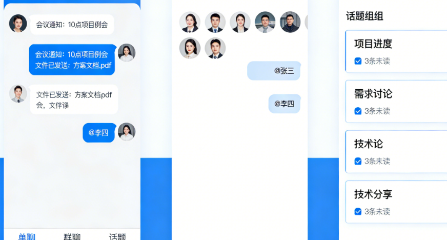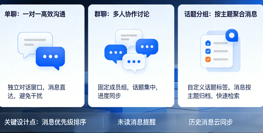 本文将从单聊、群聊、话题分组三个维度,系统拆解办公APP即时通讯的设计逻辑,探讨如何让工作沟通既高效又清晰,真正做到“不乱不散”。