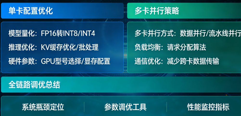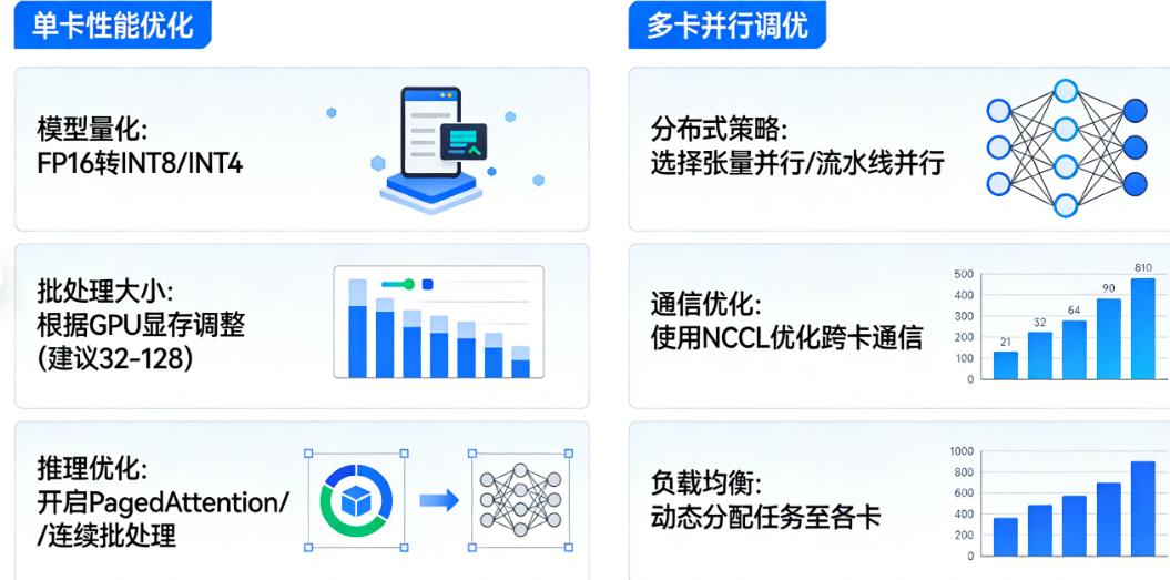 单节点多GPU使用张量并行:如果模型太大无法装入单卡,但可以在单节点的多个GPU上装下,使用张量并行。例如在4卡节点上设置tensor_parallel_size=4。张量并行将模型参数在每个模型层的多个GPU之间分片,是单节点内大型模型推理最常用的策略。