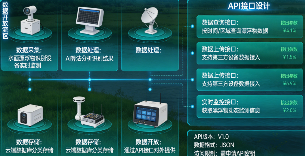 解决这个问题的核心,在于一套设计良好的数据开放体系。而数据开放的“总开关”,就是API接口——应用程序编程接口。简单来说,API就是一套标准化的“对话协议”,让不同的系统能够互相理解、交换数据,就像两个人说同一种语言一样顺畅。本文将系统拆解水面漂浮物识别系统的数据共享方案,从数据开放的标准选择、API接口的设计原则到实际落地中的安全与权限管理,帮你理清“数据怎么给出去、给谁用、怎么保证安全”的全套思路。